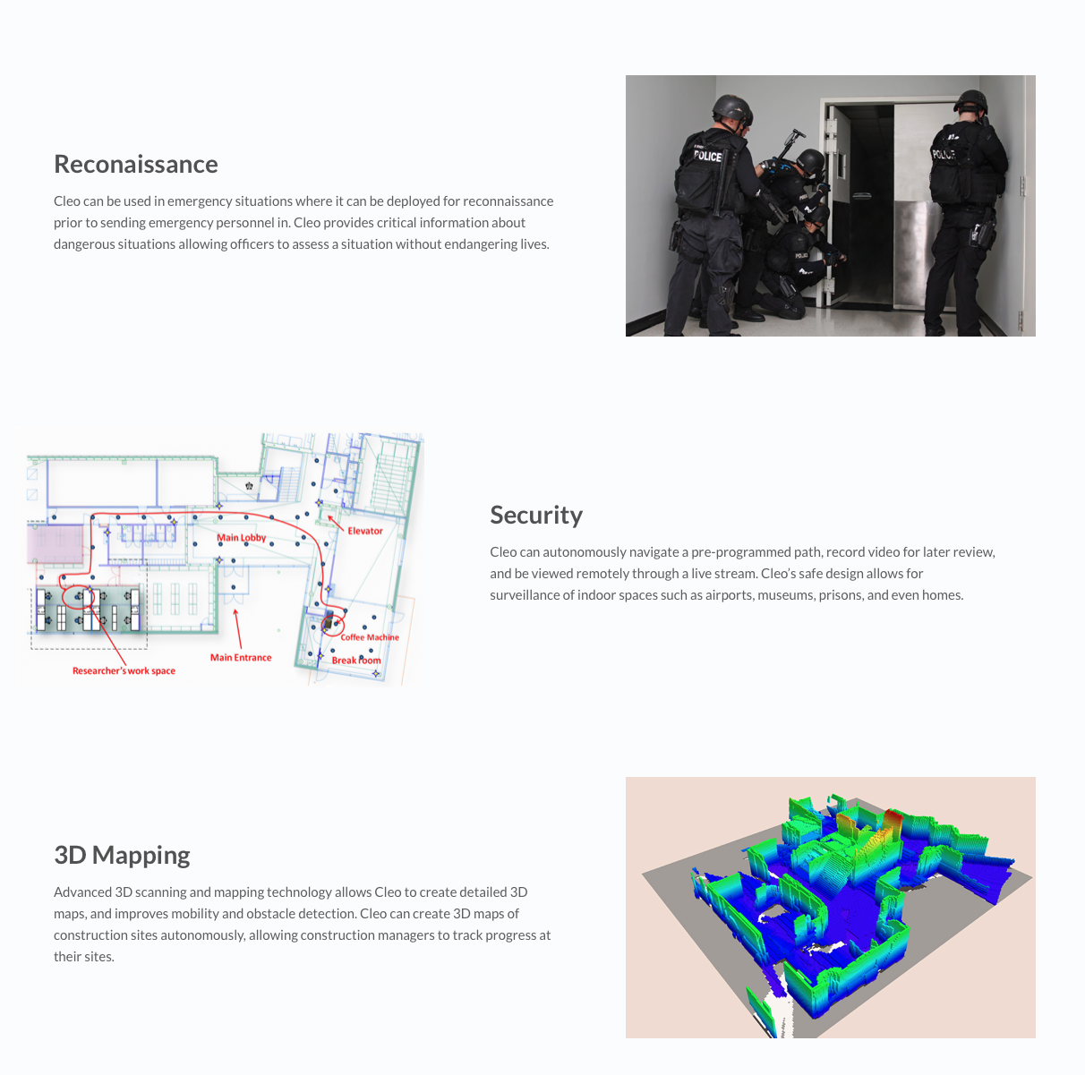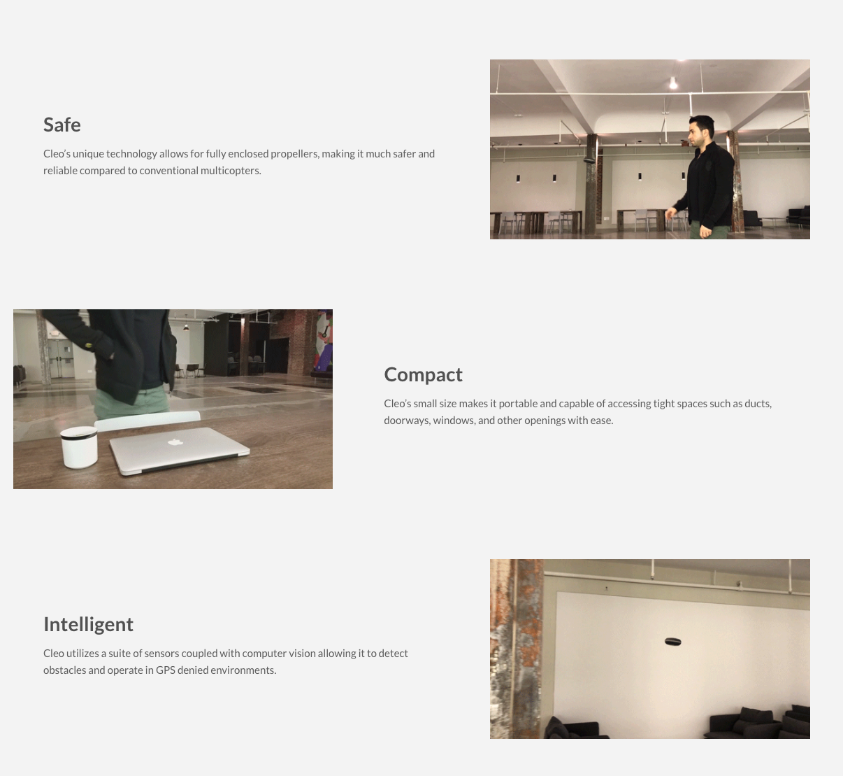 Cleo Robotics is developing a revolutionary new drone technology designed specifically for indoor applications. Current drones are not suited for flight in enclosed spaces because of their size and inherent risks due their exposed propellers. We overcame these problems through our unique patent pending technology, which also makes Cleo 70% smaller than other drones of comparable functionality.